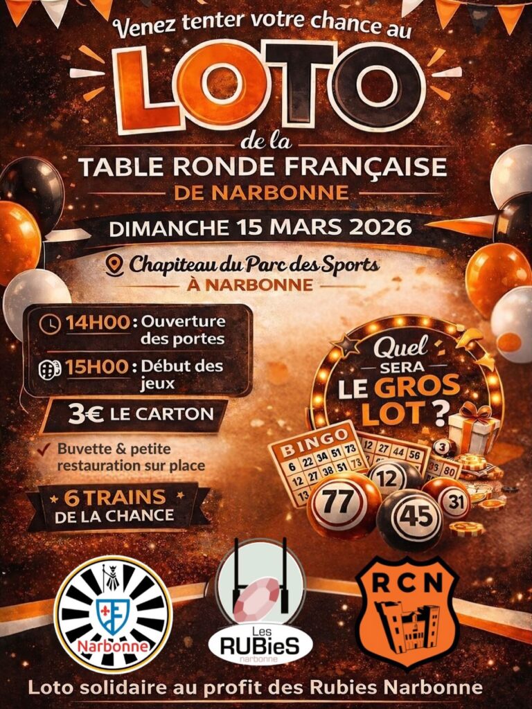 Le dimanche 15 mars, le chapiteau du Parc des Sports et de l’Amitié accueillera un événement placé sous le signe de la solidarité : le loto organisé par la Table Ronde Française de Narbonne en partenariat avec le Racing Club Narbonnais.